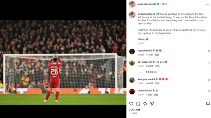 罗伯逊社媒: 告别利物浦和红军球迷是我人生中最艰难的决定之一