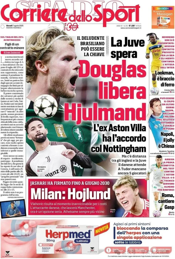 1、尤文希望:道格拉斯释放尤尔曼德。这位令人失望的巴西中场可能是关键,前阿斯顿维拉球员已经和诺丁汉森林达成协议,但这家英超俱乐部和尤文之间还有差距,丹麦人在等待。图多尔仍然缺少5名球员。