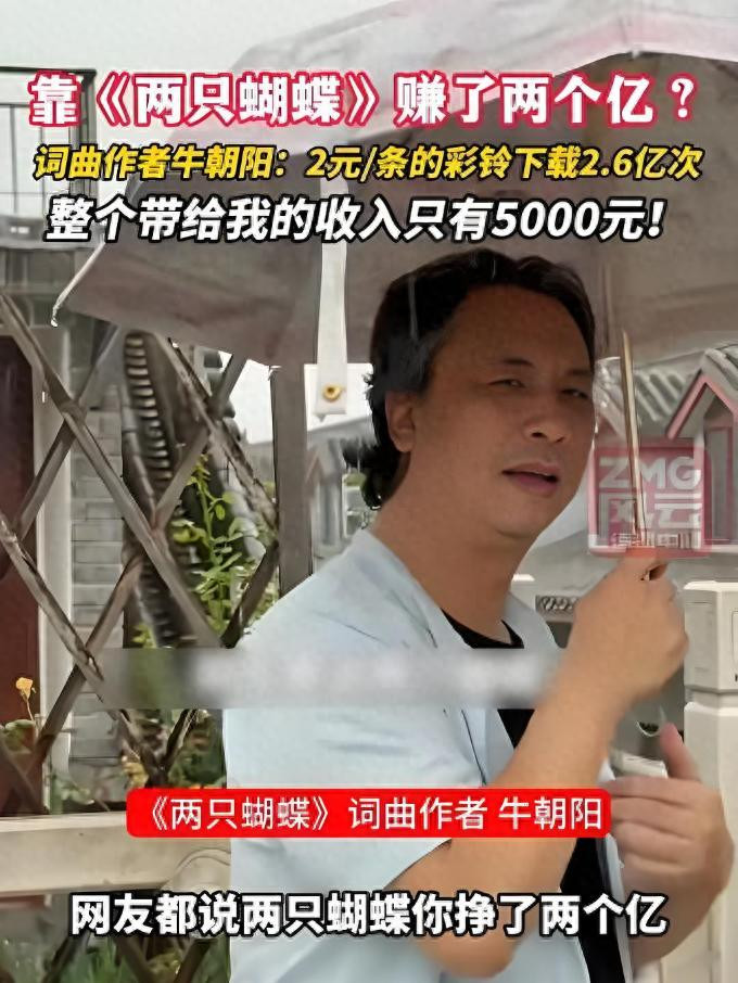 “而我本人的收入说出来大家就更震惊了,从头到尾带给我的收入为5000元。”面对网传“靠《两只蝴蝶》赚了2个亿”的说法,词曲作者牛朝阳在镜头前平静地拆穿了这个持续二十年的财富神话。