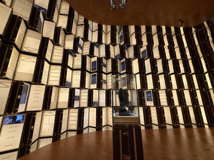 被评价为如同奢侈品巨头的跨界艺术实验秀!LV硬箱宇宙中85只经典硬箱螺旋堆叠成12米「知识穹顶」,Dior工艺圣殿用全息投影的迪奥先生虚拟形象复刻1947年工作室的场景,还有佩戴结构符合人体工程学的科技感新式项链……