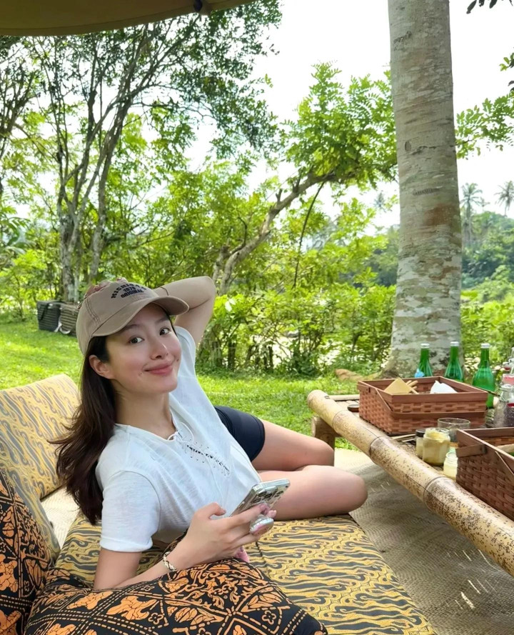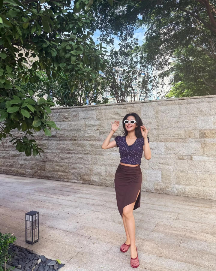 杨采钰产后晒照, 穿露脐装腰很粗, 小肚子突起还未恢复