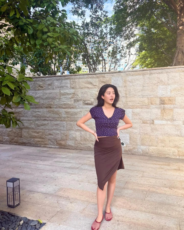 如果没猜错的话现在的杨采钰已经是生完孩子的状态,她穿着露脐装和高开叉半身裙,腰上的肉感很足,而且她的小肚腩在紧身裙的包裹下比较突出,很明显就是产后没多久,身体还没有完全恢复,特别是肚子上。