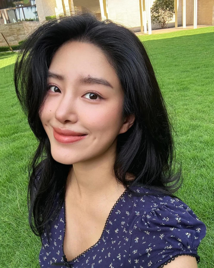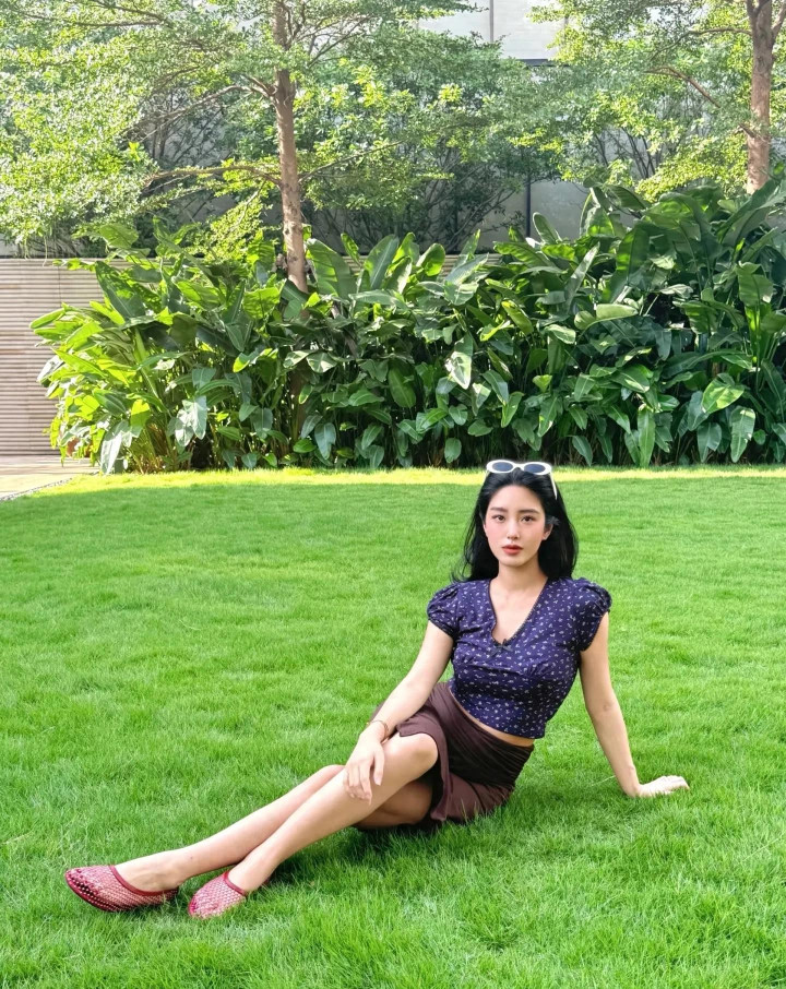 杨采钰晒出自己坐在草坪上的照片,露出细长的双腿和双臂,穿搭非常时尚。