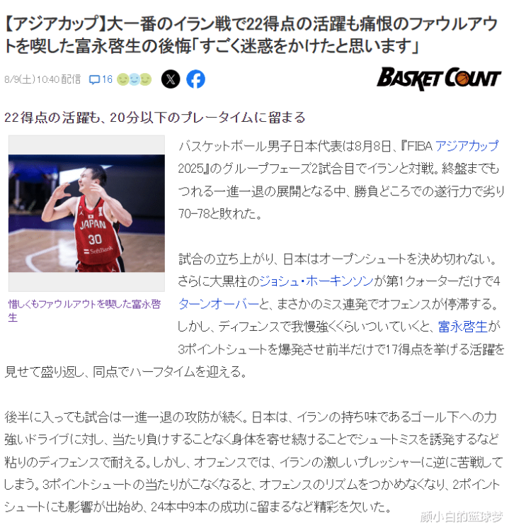 这场比赛日本的失利跟富永启生的犯规有很大关系,赛后霍瓦斯在采访中直接批判富永启生与西田优大在决胜时刻两人连续4次犯规打乱球队进攻节奏,富永启生也因为5犯离场,这导致球队最后3分多钟-4分钟没有运动战进球,这就是球队末节被逆转的关键。