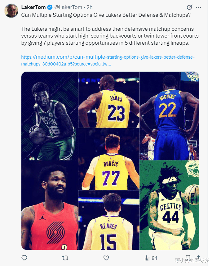 这笔交易后他认为湖人可以用多套先发组合、轮换组合,轮换组合的配置以先发为准,他列出的吴涛还有一套没有詹姆斯,他认为在赛季末可以提前让詹姆斯进入轮休状态,毕竟即将年满41岁。