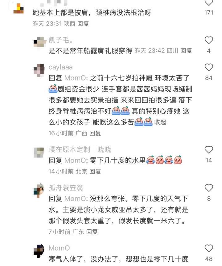 有粉丝指出,刘亦菲披着披肩也是“无奈之举”,原来她有很严重的颈椎病,是早年拍摄《神雕侠侣》落下的,当时的她才十六岁,剧组资金很少,大部分都需要实景拍摄,而天气又很寒冷,所以那时的她就落下了病根。