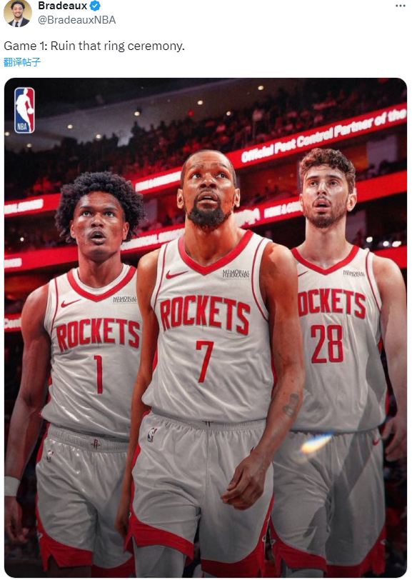 火箭媒体人Bradeaux在社交媒体上晒出火箭三巨头P照,并配文写道:揭幕战,毁了那个颁奖典礼。