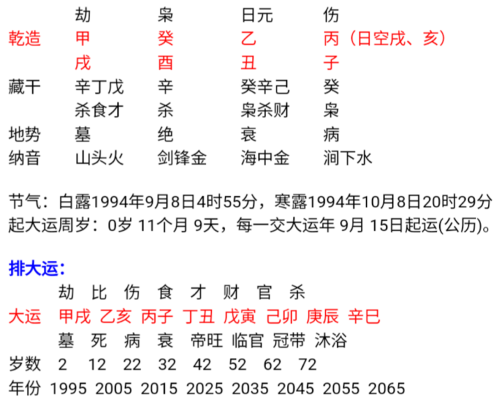 戌财,与己无关,被甲制,甲弱,制财无力,且酉戌穿,损印元神,远财不易追求。