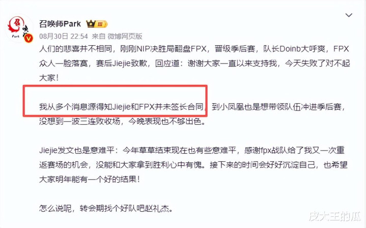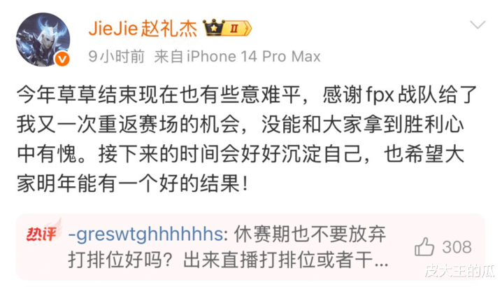 除此之外,jiejie来到FPX战队的时间并不长,队伍成员之间的磨合程度也不够,能够和NIP战队打满五局在我个人看来已经是很不容易的了,而且根据爆料,jiejie和FPX战队并没有签长期合同,jiejie自己发文也表示今年有些意难平,希望明年有一个好的结果。