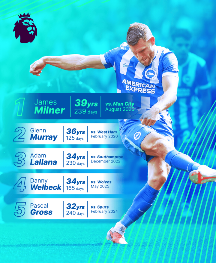 1、米尔纳,39岁239天,2025年8月对阵曼城时破门